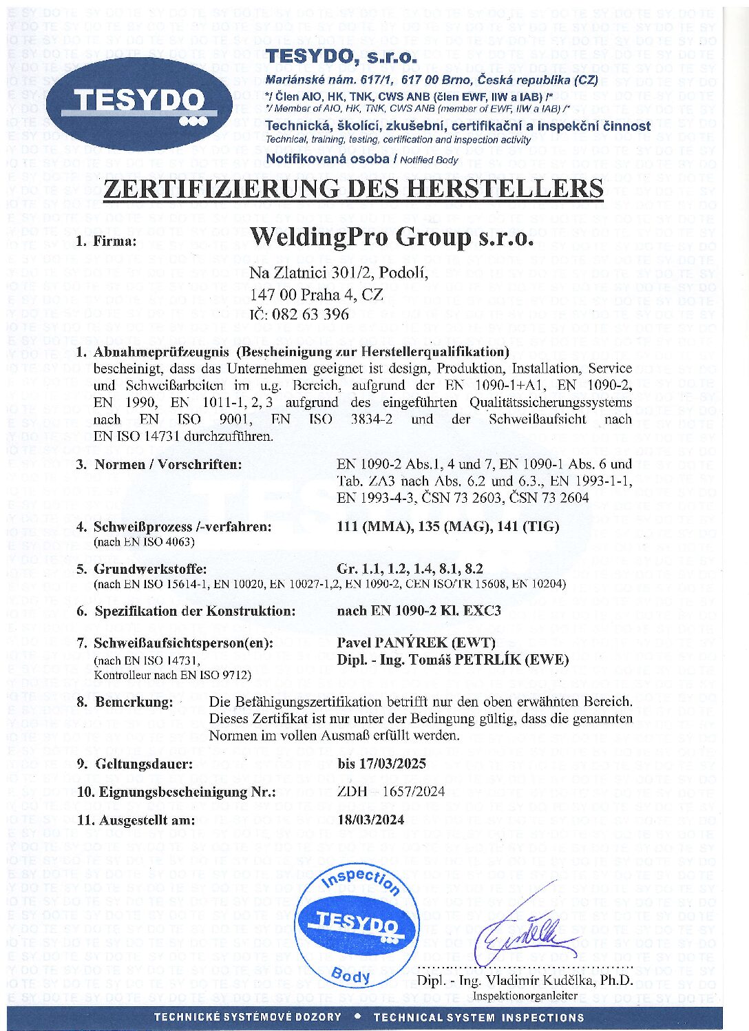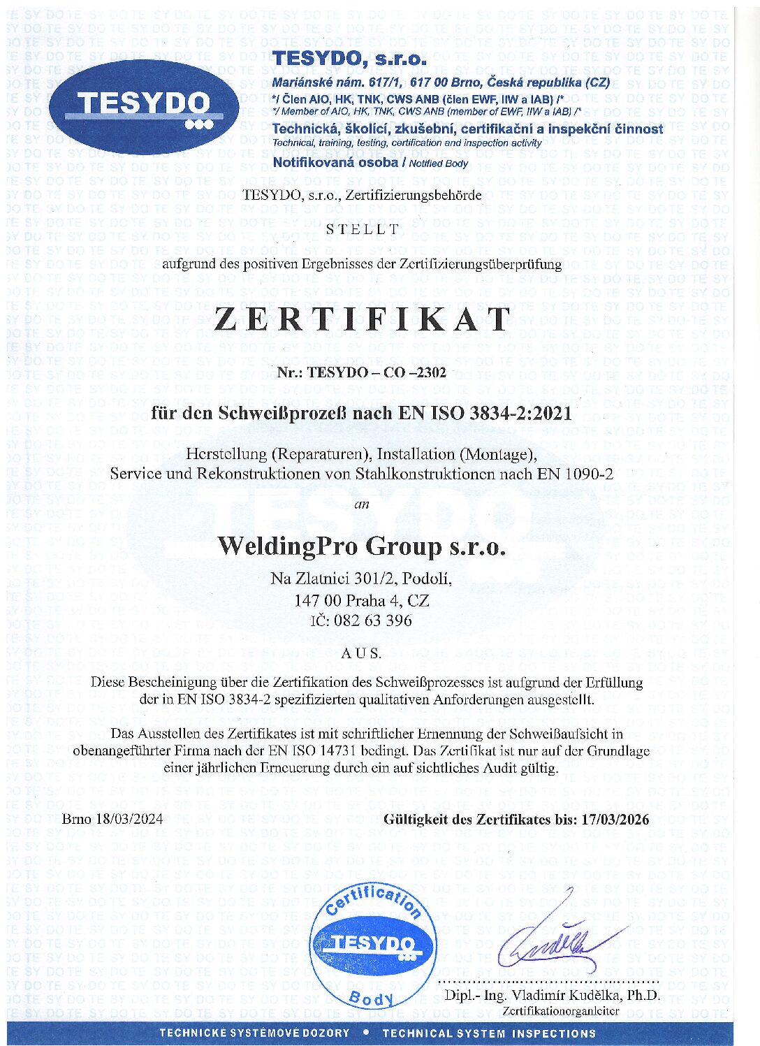 Zertifikat für den Schweissprozess ČSN EN ISO 3834-2